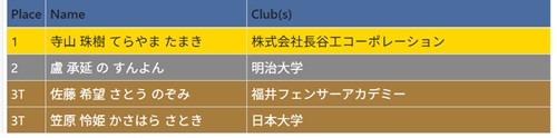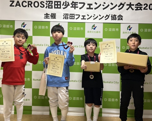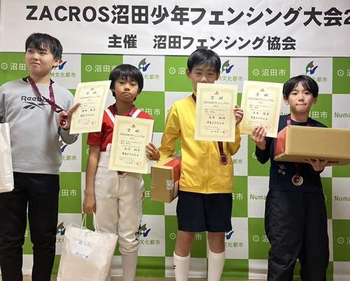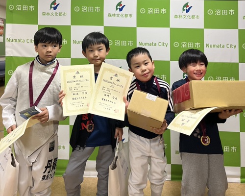 [小学1・2年男子フルーレ]優勝 鎌田 柊 [小学1・2年女子フルーレ]2位 山口彩七 [小学3・4年男子フルーレ]2位 佐伯 純 3位 青木凜乃介 4位 青池奏翔 [小学3・4年女子フルーレ]優勝 石ア柚貴 2位 鎌田紗幸 3位 山口真生 [小学5・6年女子フルーレ]優勝 佐伯 華 2位 新井菜月 4位 青池音波 [小学男子エペ] 優勝 滝沢快斗 [小学女子エペ] 優勝 佐伯 華 [小学女子サーブル] 優勝 新井菜月 2位 青池音波 3位 大竹悠琳 [中学男子フルーレ] 優勝 金井駿平 2位 青木大河 3位 宮田壮祐 [中学女子フルーレ] 優勝 小嶌莉央 3位 小林ひな 3位 鎌田紗和 4位 井上雅菜実 [中学男子エペ] 2位 原澤月之丞 3位 青木大河 [中学女子エペ] 2位 石ア実音 3位 青池香音 4位 井上雅菜実 [中学男子サーブル] 優勝 金井駿平 2位 宮田壮祐 [中学女子サーブル] 優勝 小林ひな 2位 鎌田紗和 3位 小嶌莉央 |
