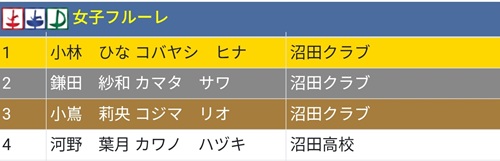 [小学1・2年男子フルーレ]優勝 鎌田 柊 [小学1・2年女子フルーレ]2位 山口彩七 [小学3・4年男子フルーレ]2位 佐伯 純 3位 青木凜乃介 4位 青池奏翔 [小学3・4年女子フルーレ]優勝 石ア柚貴 2位 鎌田紗幸 3位 山口真生 [小学5・6年女子フルーレ]優勝 佐伯 華 2位 新井菜月 4位 青池音波 [小学男子エペ] 優勝 滝沢快斗 [小学女子エペ] 優勝 佐伯 華 [小学女子サーブル] 優勝 新井菜月 2位 青池音波 3位 大竹悠琳 [中学男子フルーレ] 優勝 金井駿平 2位 青木大河 3位 宮田壮祐 [中学女子フルーレ] 優勝 小嶌莉央 3位 小林ひな 3位 鎌田紗和 4位 井上雅菜実 [中学男子エペ] 2位 原澤月之丞 3位 青木大河 [中学女子エペ] 2位 石ア実音 3位 青池香音 4位 井上雅菜実 [中学男子サーブル] 優勝 金井駿平 2位 宮田壮祐 [中学女子サーブル] 優勝 小林ひな 2位 鎌田紗和 3位 小嶌莉央 |