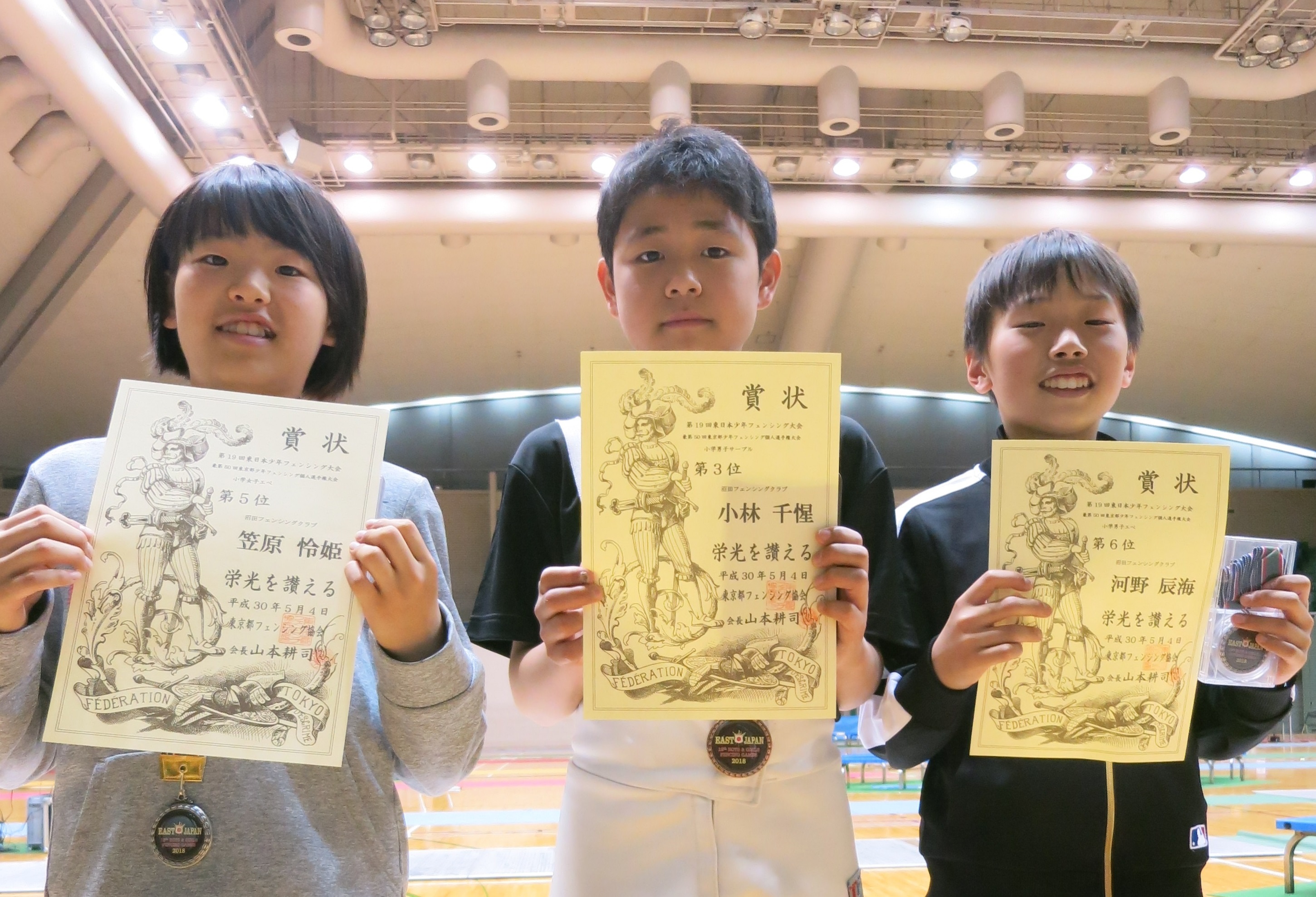 | 5月3日〜5日 | 第4回東日本少年フェンシング大会 | ○中学男子サーブル 第3位 峰岸佳吾 ○小学女子エペ 第5位 笠原怜姫 ○小学男子サーブル 第3位 小林千惺 ○小学男子エペ 第6位 河野辰海 |