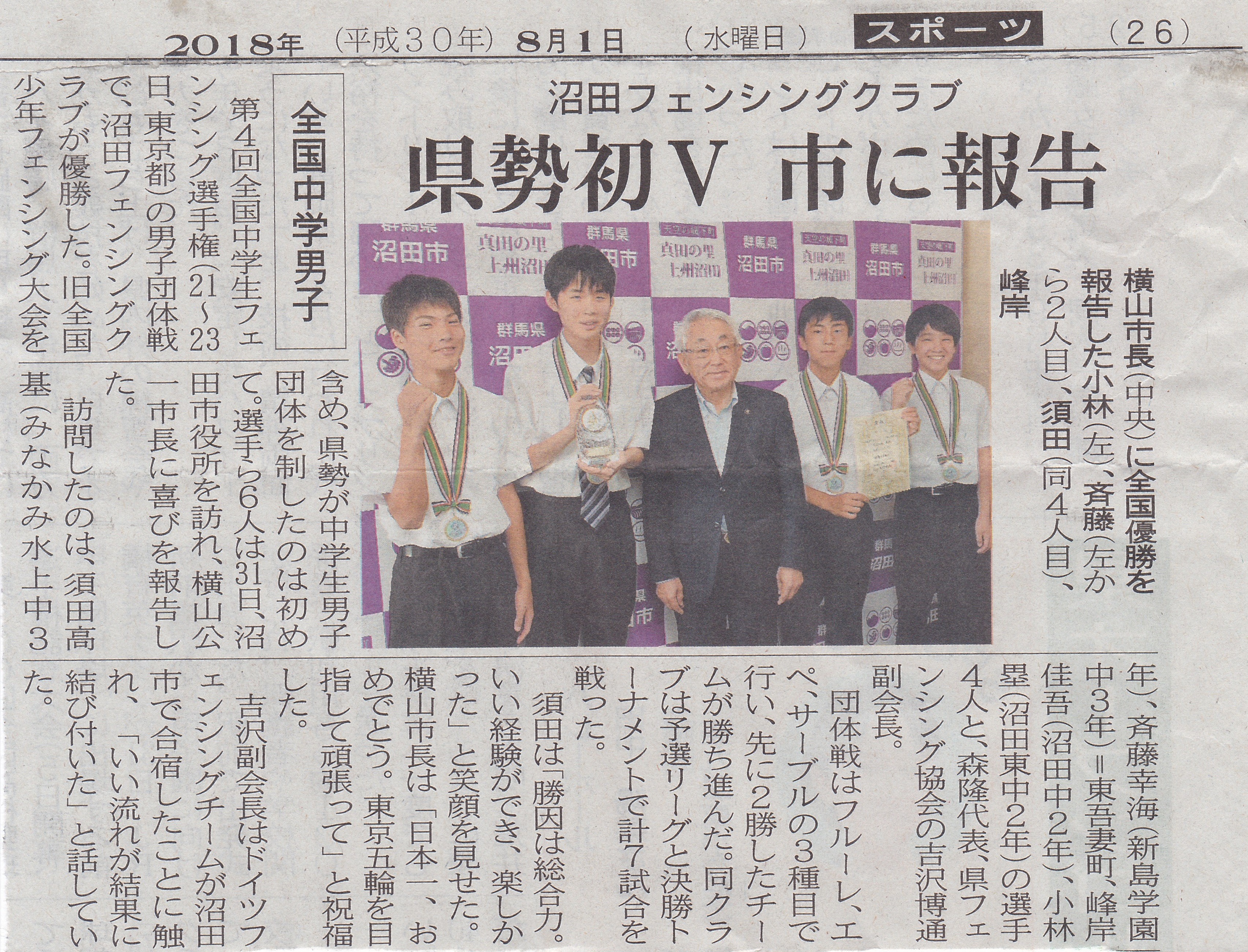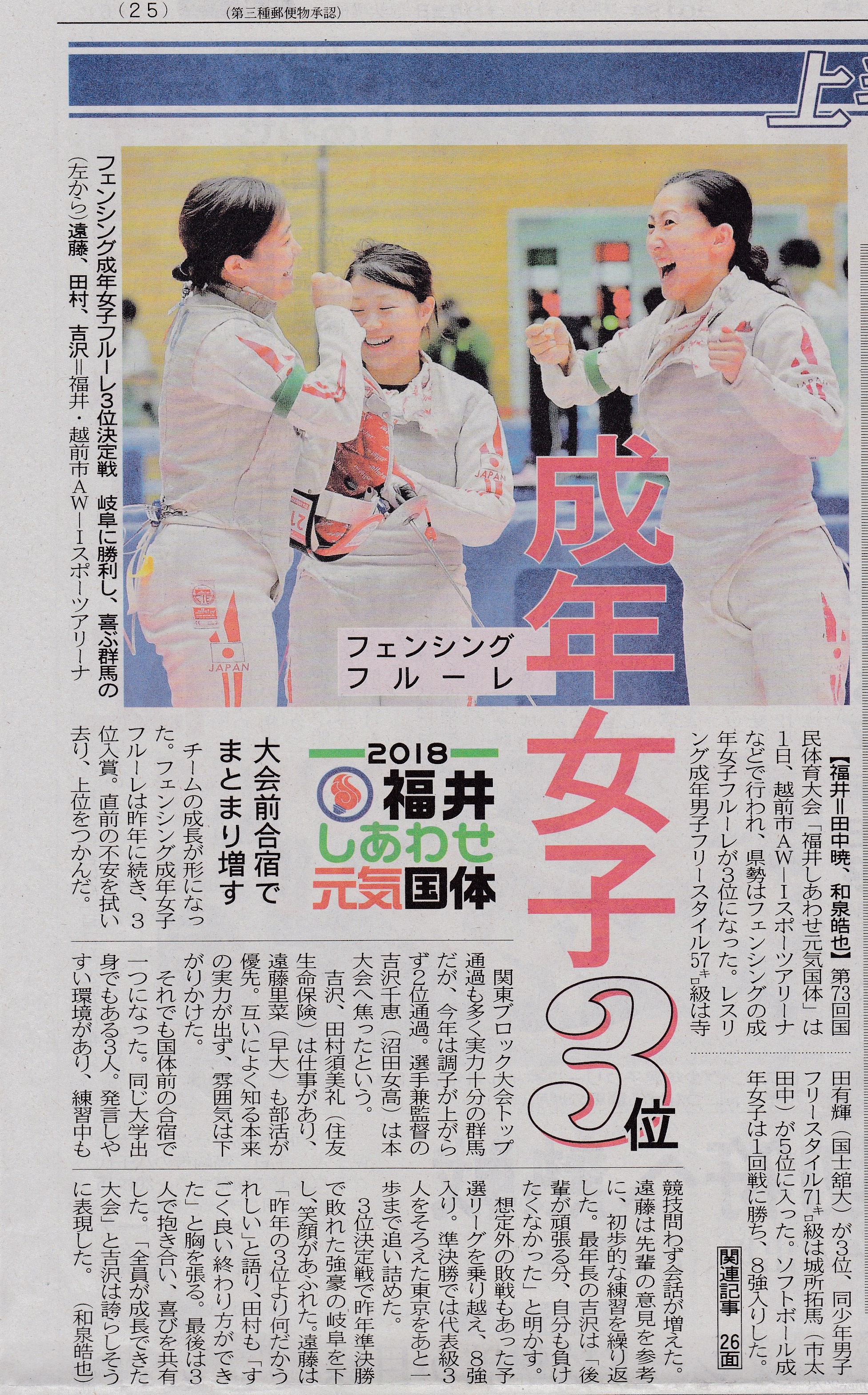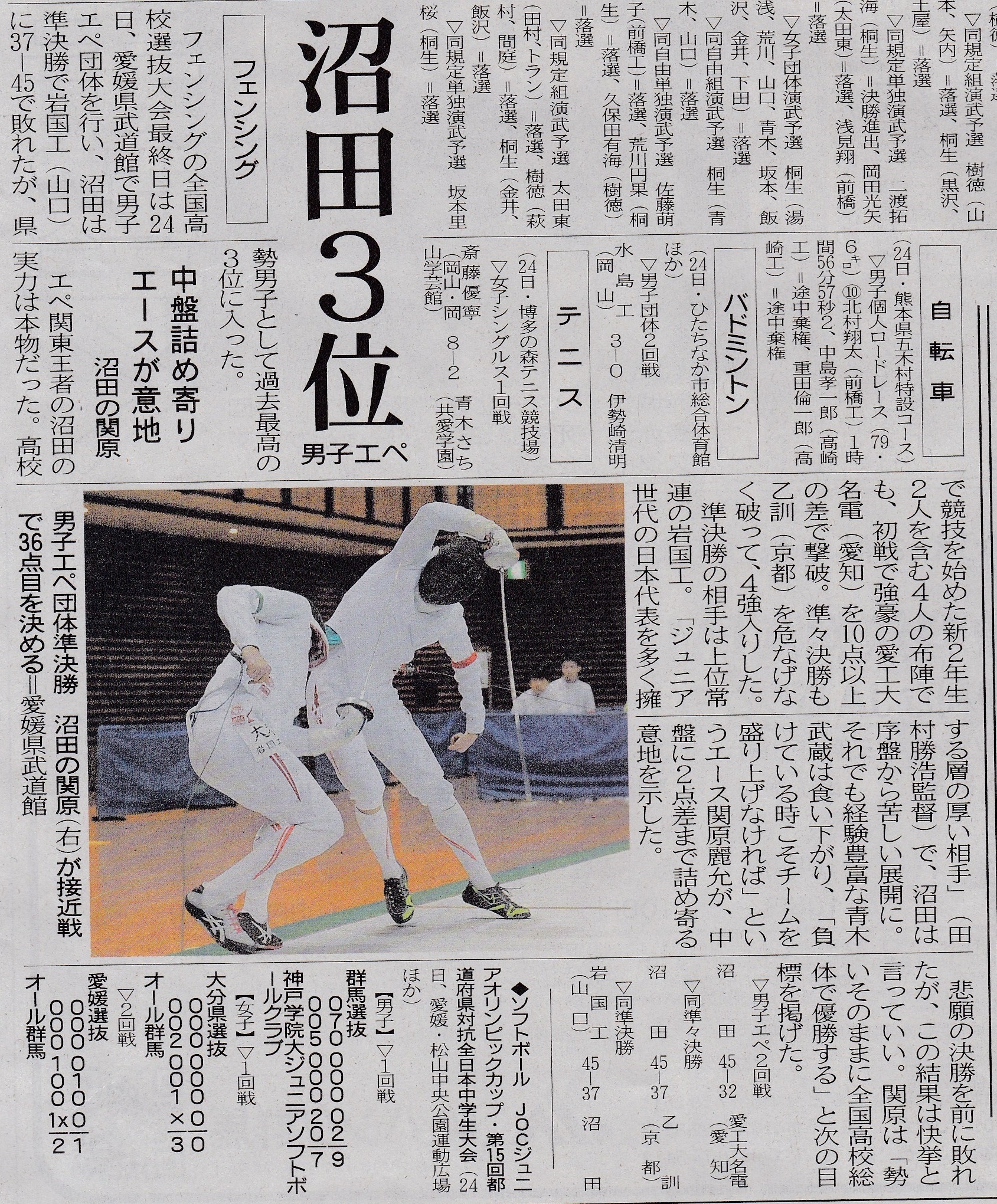 2位 峰岸佳吾(沼田クラブ) 3位 松本純也(沼田高校) 4位 青木武蔵(沼田高校) [男子エペ] 優勝 佐伯 悠(沼田クラブ) 4位 小林 塁(沼田クラブ) [男子サーブル] 優勝 松本純也(沼田高校) 2位 井口涼太(沼田高校) [女子フルーレ] 優勝 吉澤千恵(沼田女子高校) 3位 鈴木花野(沼田女子高校) [女子エペ] 2位 阿部芽依奈(沼田女子高校) 3位 井上詩織(沼田女子高校) 4位 田村李緒(沼田女子高校) [女子サーブル] 優勝 鈴木花野(沼田女子高校) 3位 堀田羽和(沼田女子高校) |
