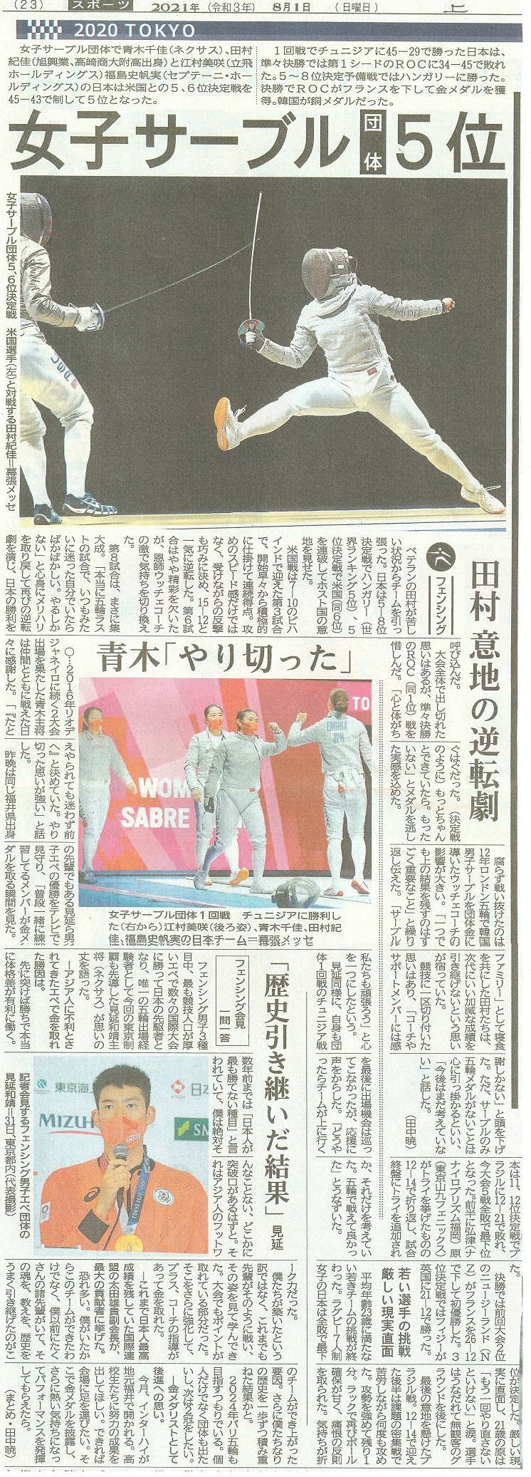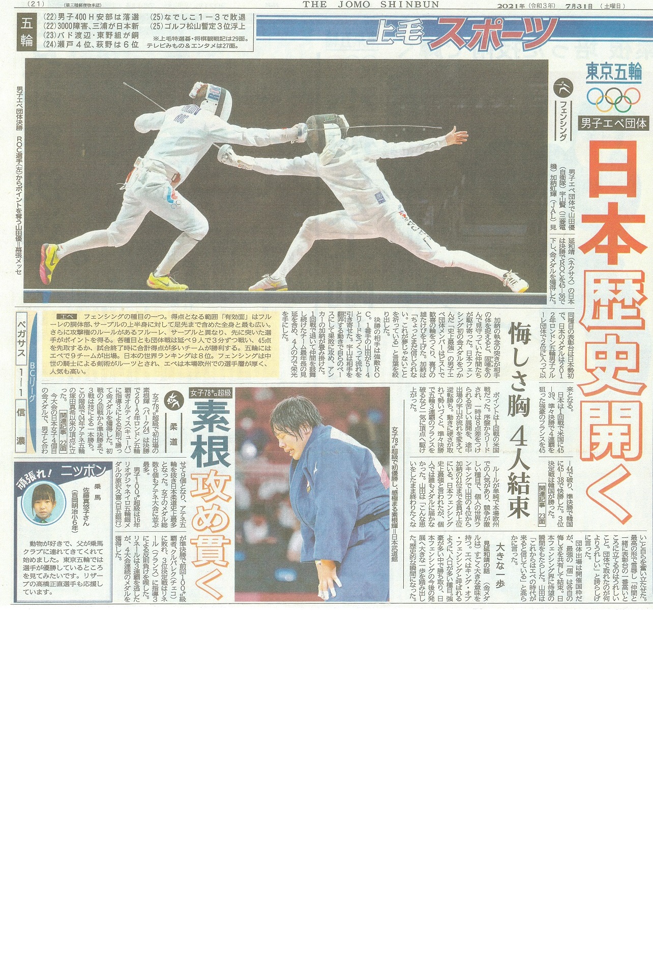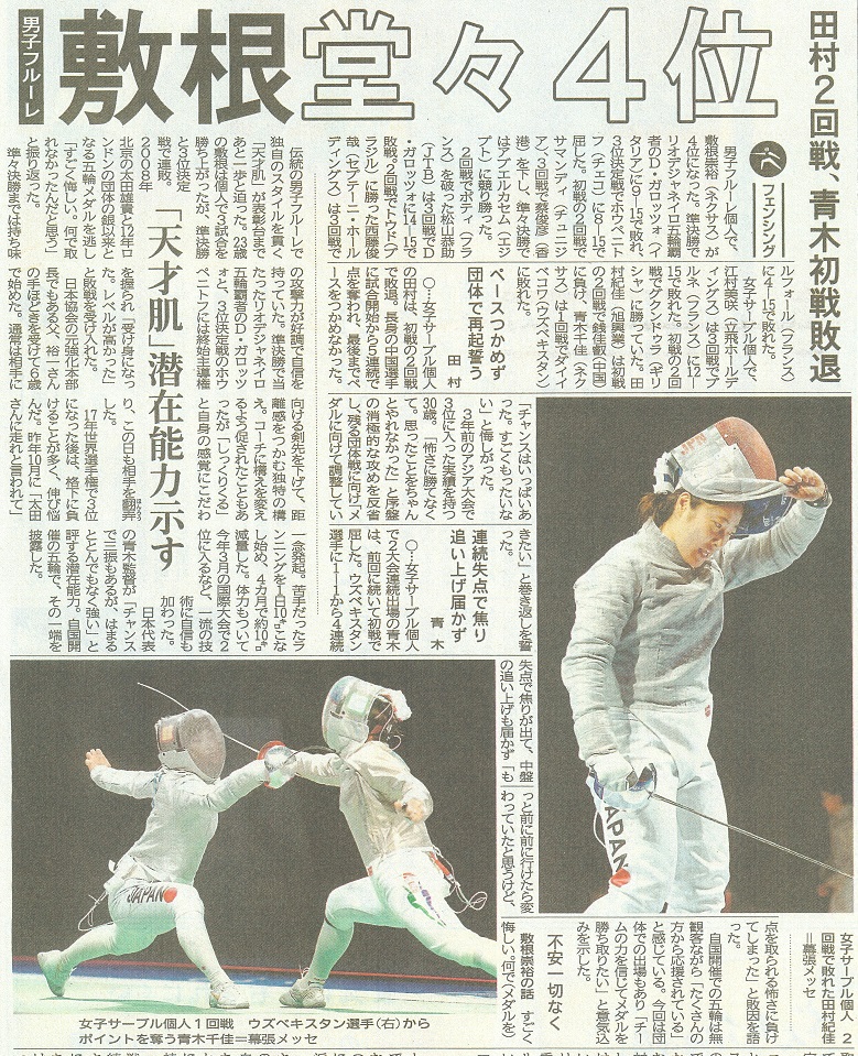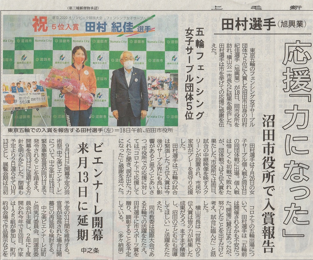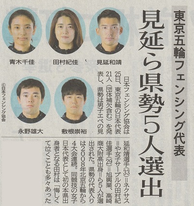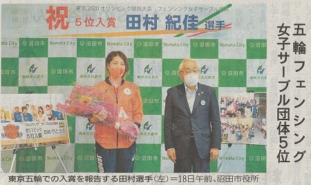 男子エペ団体 史上初の金メダル獲得!上毛新聞(7月31日)男子フルーレ団体 イタリアを撃破もフランスに惜敗、米国に敗れ4位 男子フルーレ個人 敷根 崇裕 3位決定戦で敗れメダルにあと一歩 上毛新聞(7月27日)