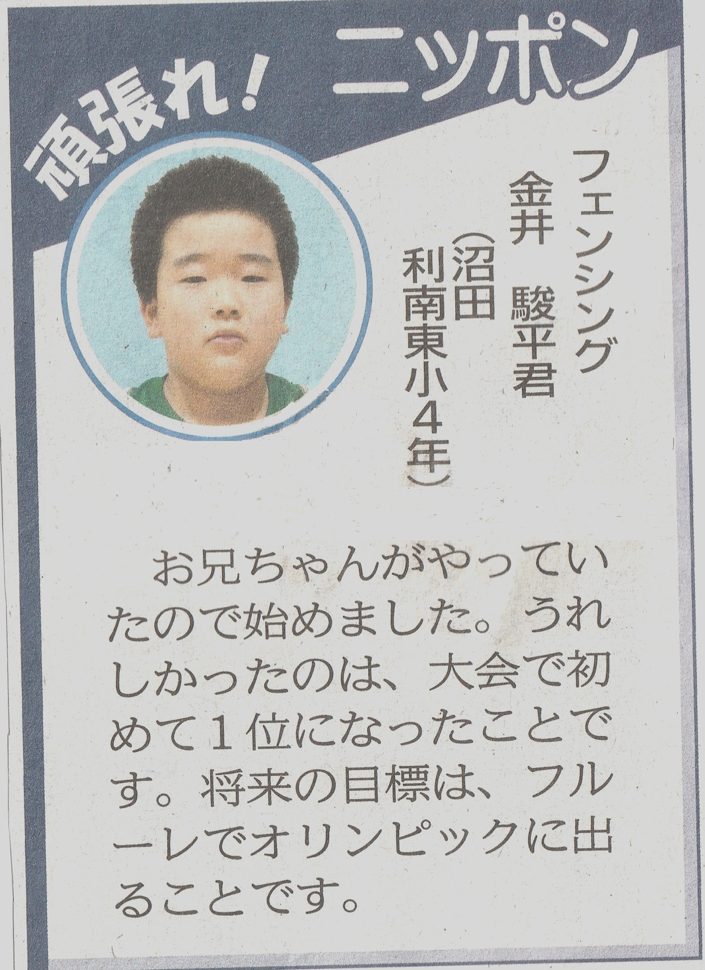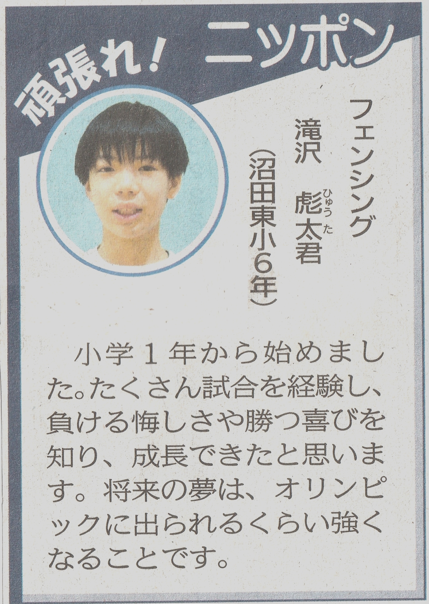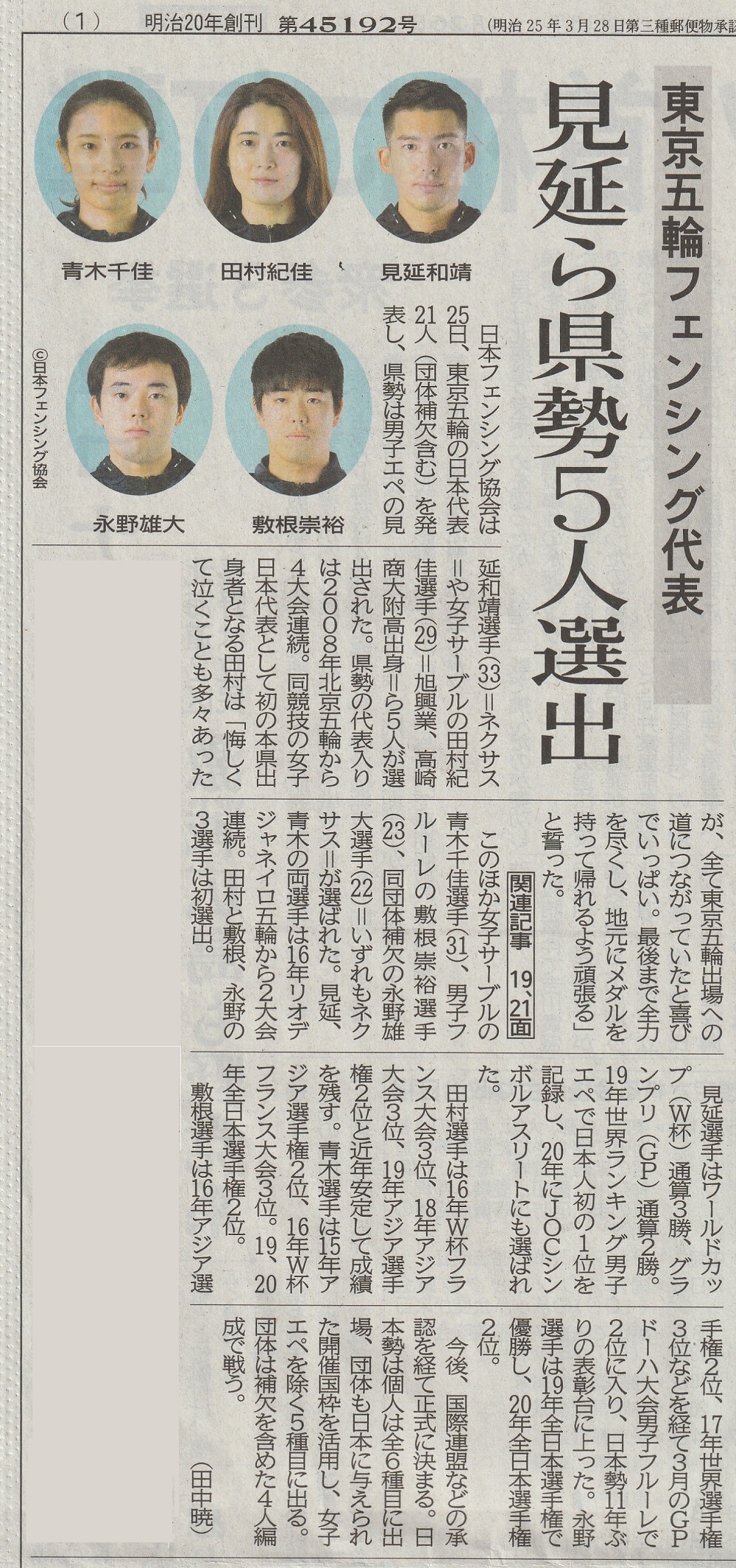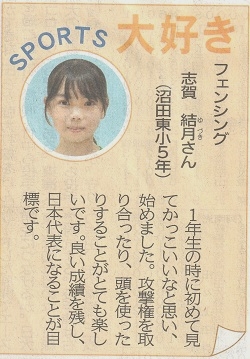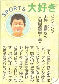 男子エペ団体 史上初の金メダル獲得!上毛新聞(7月31日)男子フルーレ団体 イタリアを撃破もフランスに惜敗、米国に敗れ4位 男子フルーレ個人 敷根 崇裕 3位決定戦で敗れメダルにあと一歩 上毛新聞(7月27日)
